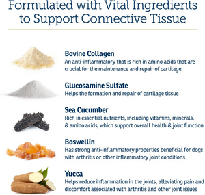 Glucosamine Sulfate, Bovine Tracheal Cartilage, Boswellin, Sea Cucumber (Pseudo-Colochirus Axiologus), Vitamin C (Ascorbic Acid), Curcumin, Ginger, Bromelain, Yucca, Calcium, Magnesium, Zinc (L-Monomethionine), Manganese, and Copper (Glycinate).