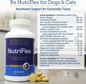 Ans: Rx Vitamins NutriFlex Nutritional Support Chewables are designed to support connective tissue health. They provide nutritional cofactors for joints, cartilage, tendons, and ligaments. The formula supports flexibility, comfort, and resilience. It is intended for active dogs and cats needing daily joint nourishment.