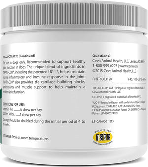 Ceva TRP-Tri-COX Joint Support Mini Soft Chews are specially recommended for small dogs and puppies to support healthy joint function. This unique formula includes patented UC-II to help sustain normal inflammatory and immune responses in the joints. It also provides cartilage-building blocks, antioxidants, and muscle support necessary for proper joint function. Available in a convenient 120 mini soft chews pack.