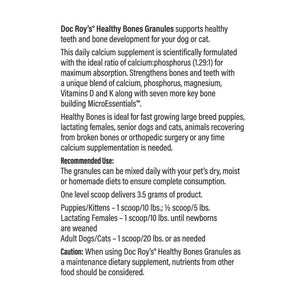 Ans: Doc Roy's® Healthy Bones supplement is designed to enhance bone and dental health in pets. Healthy Bones granules provide a balanced calcium-to-phosphorus ratio, magnesium, and Vitamin D3. These nutrients improve bone density, support tooth strength, and help puppies, kittens, and adult dogs maintain optimal skeletal development daily.