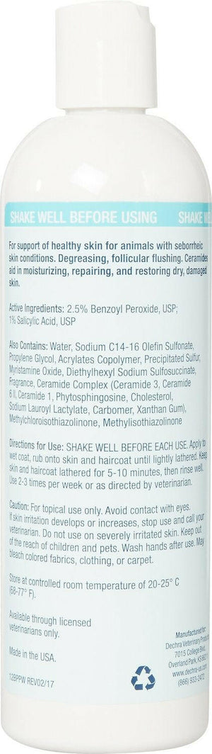 Designed for use on oily and scaly skin (seborrhea oleosa), superficial and deep pyodermas, crusty pyodermas, and can also be used as adjunctive therapy for generalized demodicosis and Schnauzer comedo syndrome or other causes of folliculitis. Benzoyl peroxide may bleach fabrics and other absorbent materials. Use carefully (gloves are recommended), and avoid contact with clothing and furnishings.